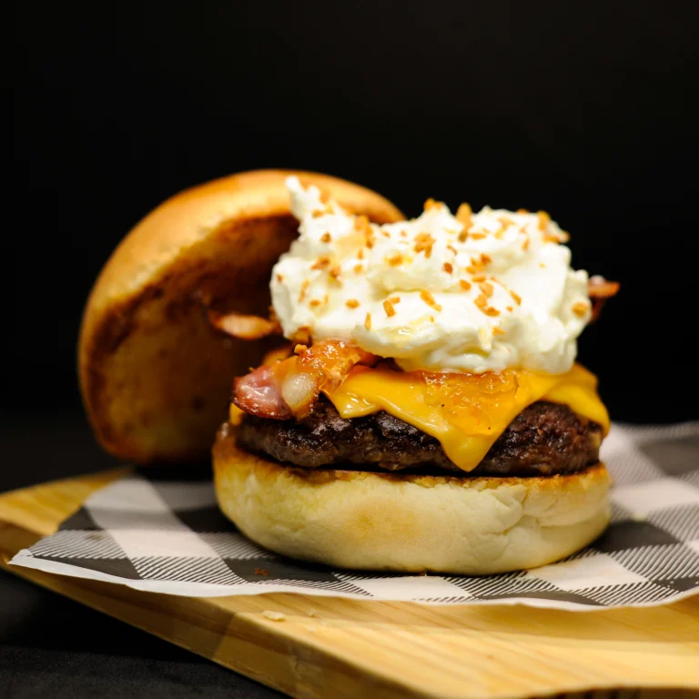 Pão de hambúrguer, maionese, 02 burgers 100g e queijo cheddar em dobro.