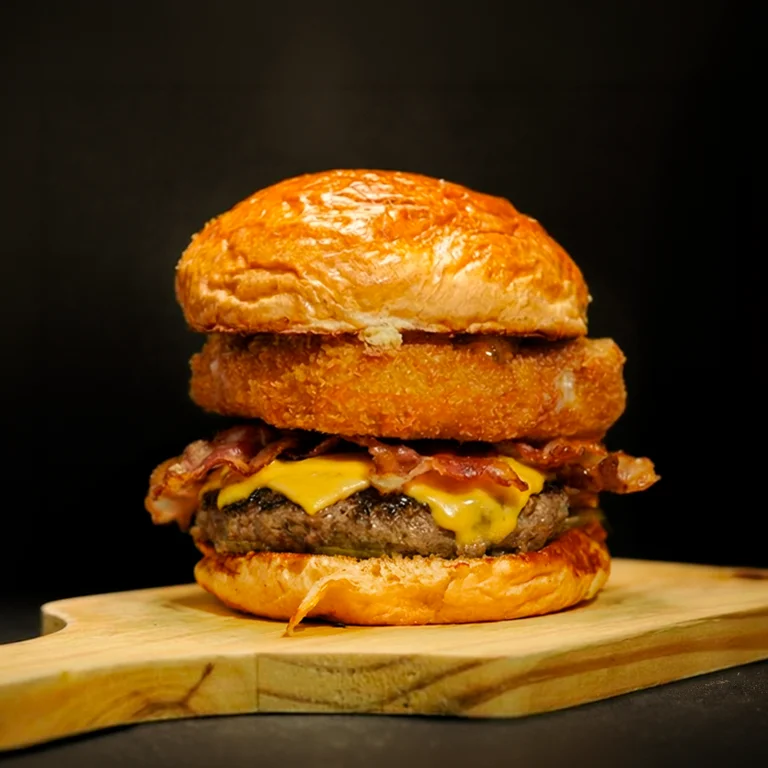 Pão brioche, maionese, buger de costela 180g, queijo cheddar, onion rings,...
